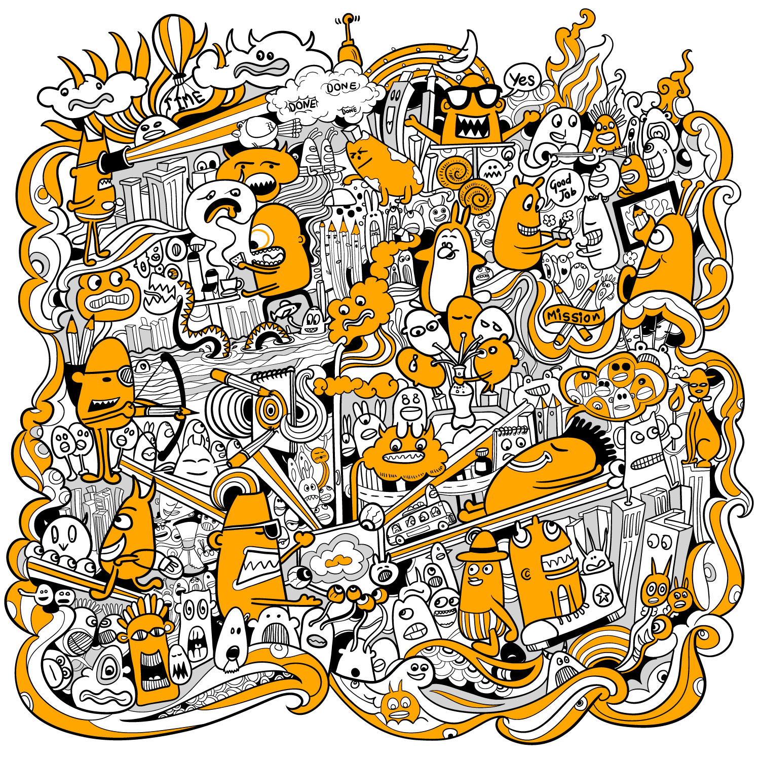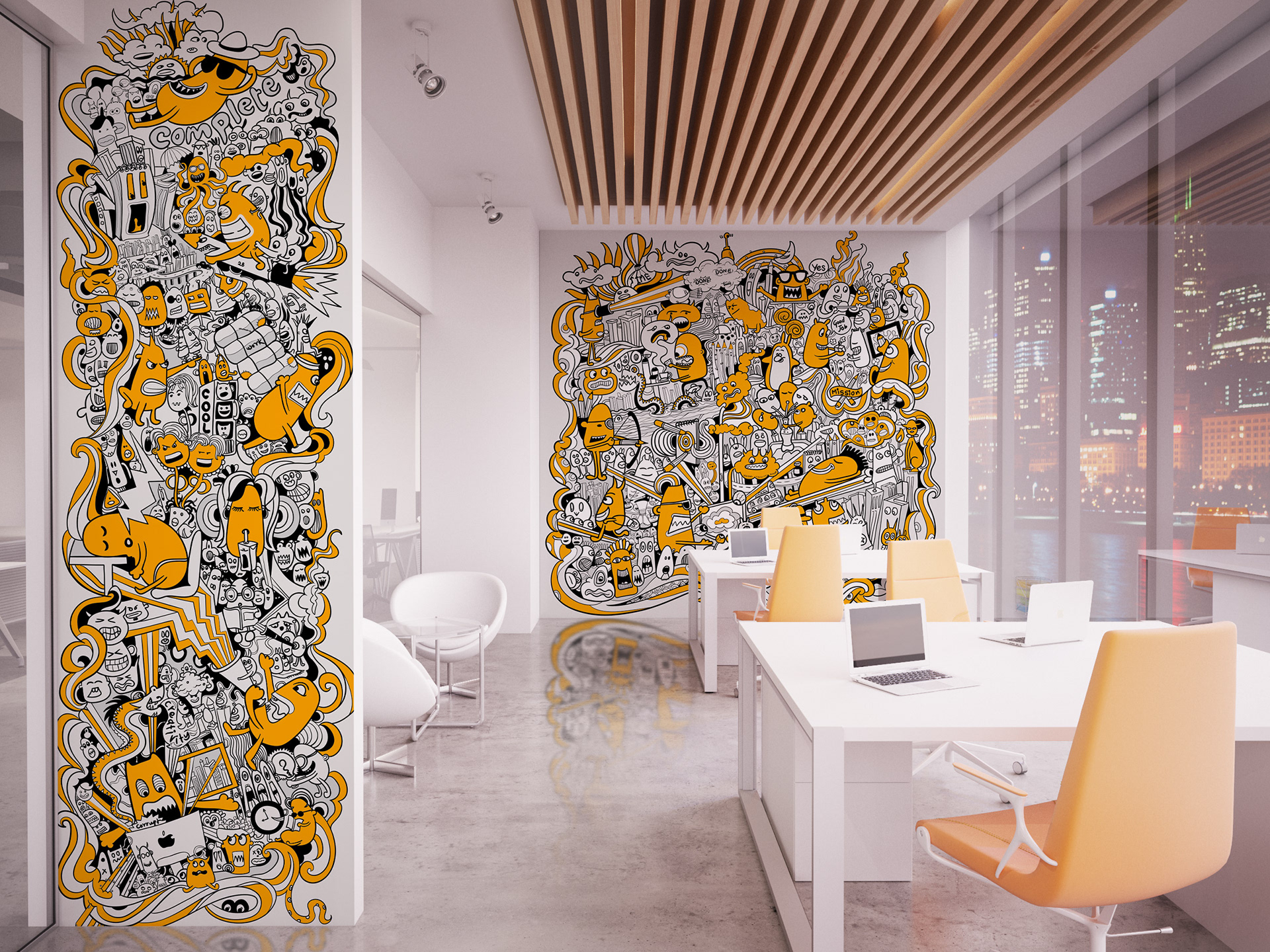 illustrating lively wall art which depicts life in a design agency in a more fun and lively way, using monster like elements to showcase the different type of people and scenarios in a creative work place
