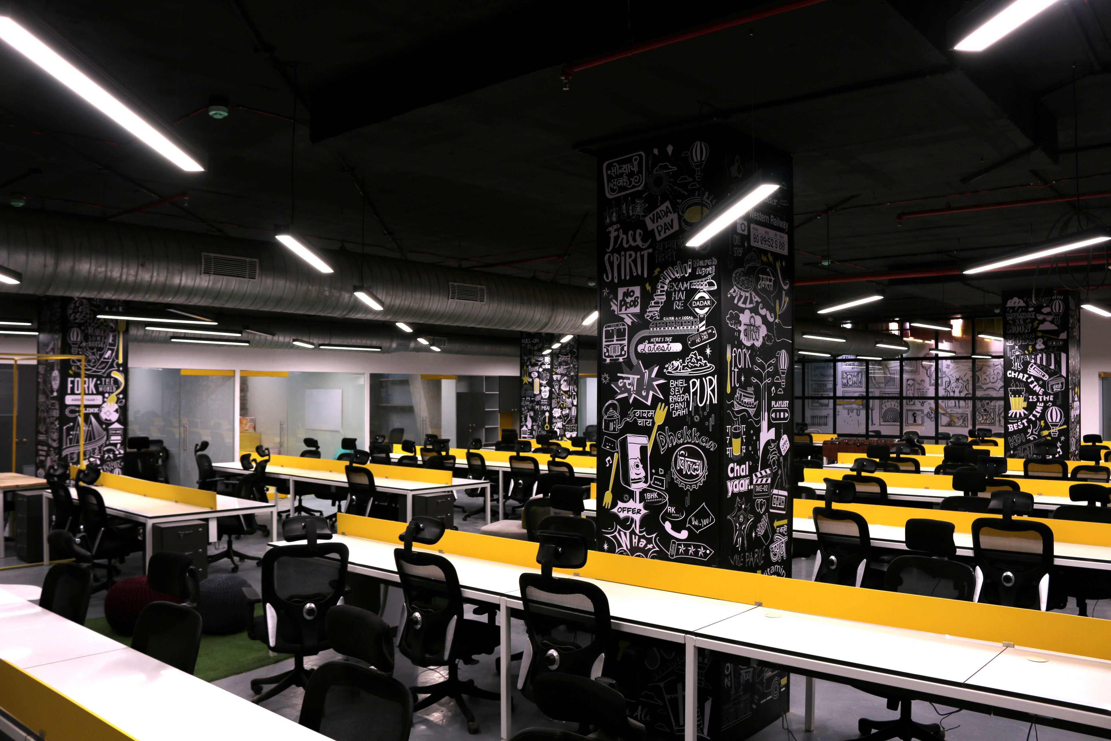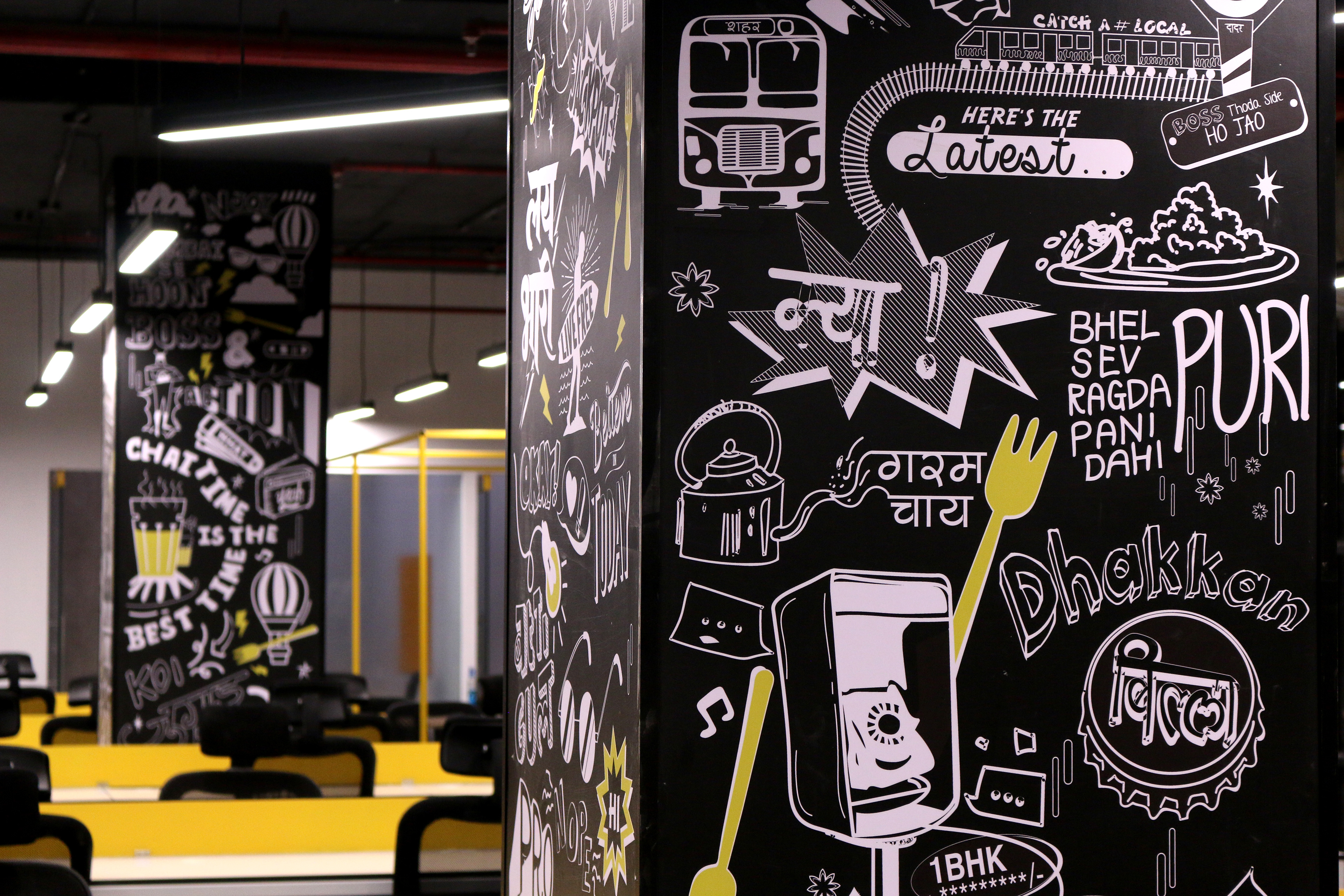 Wall mural designs hand done for a media agency called Fork Media in Mumbai. The project required us to jazz up their new office space with quirky doodles reflecting the media culture with an element of pop and desi-ness. Each wall is carefully designed keeping the theme of the wall, for instance the reception wall denotes graphics and typography which is more welcoming, using words like hello. The conference room wall has a lot of media elements and personal elements pertaining to the brand service and office environment, using slangs. The pillars consist of a lot of desi-ness sticking to the Mumbai culture. Each of the cheeseboards in the cafeteria were individually painted with different quotes and illustrations pertaining to food. The play room consists of metal boards, which are inspired by the U.S number plates, and lastly the bathroom walls showcasing pipes, and funny quotes catering to the men and women individually