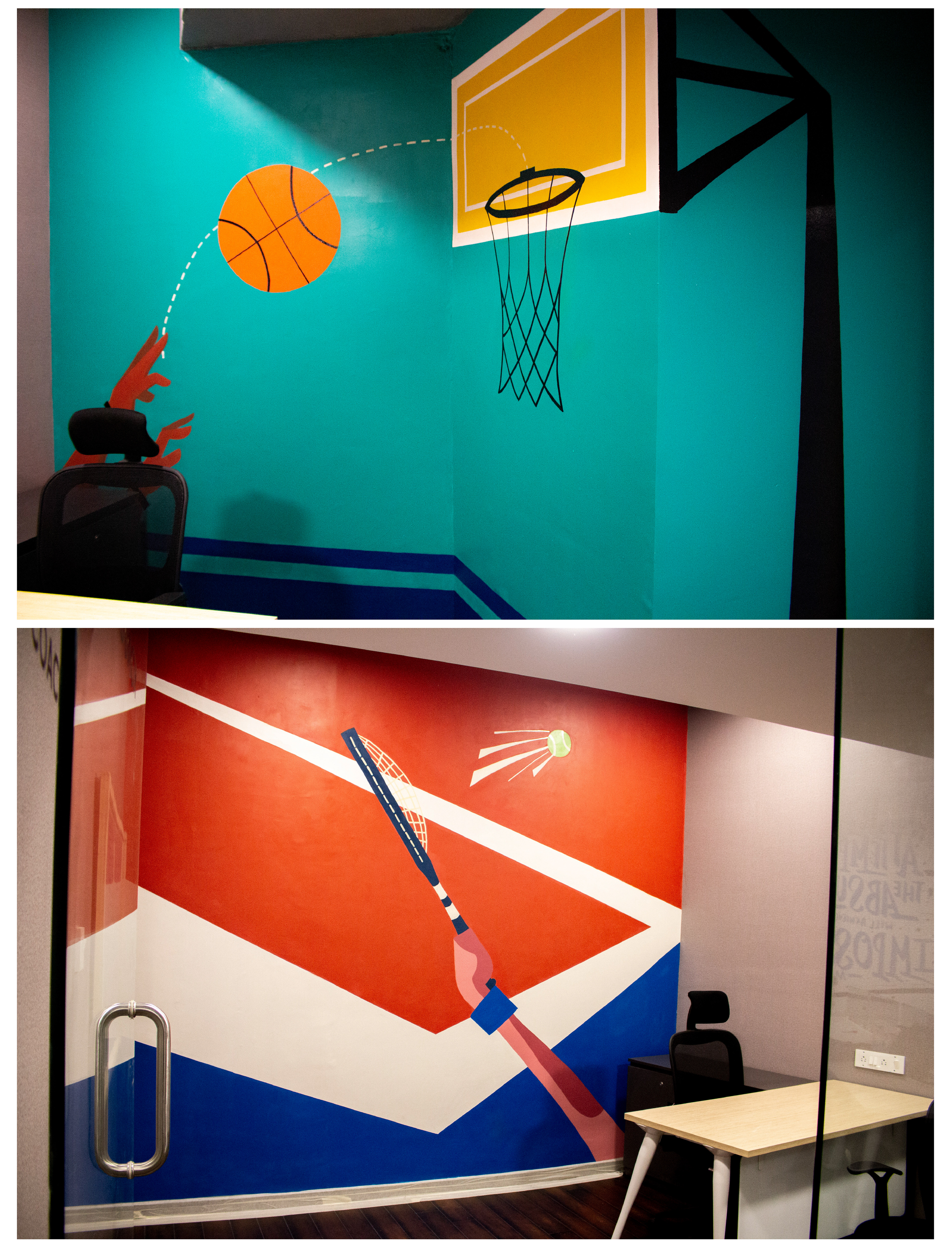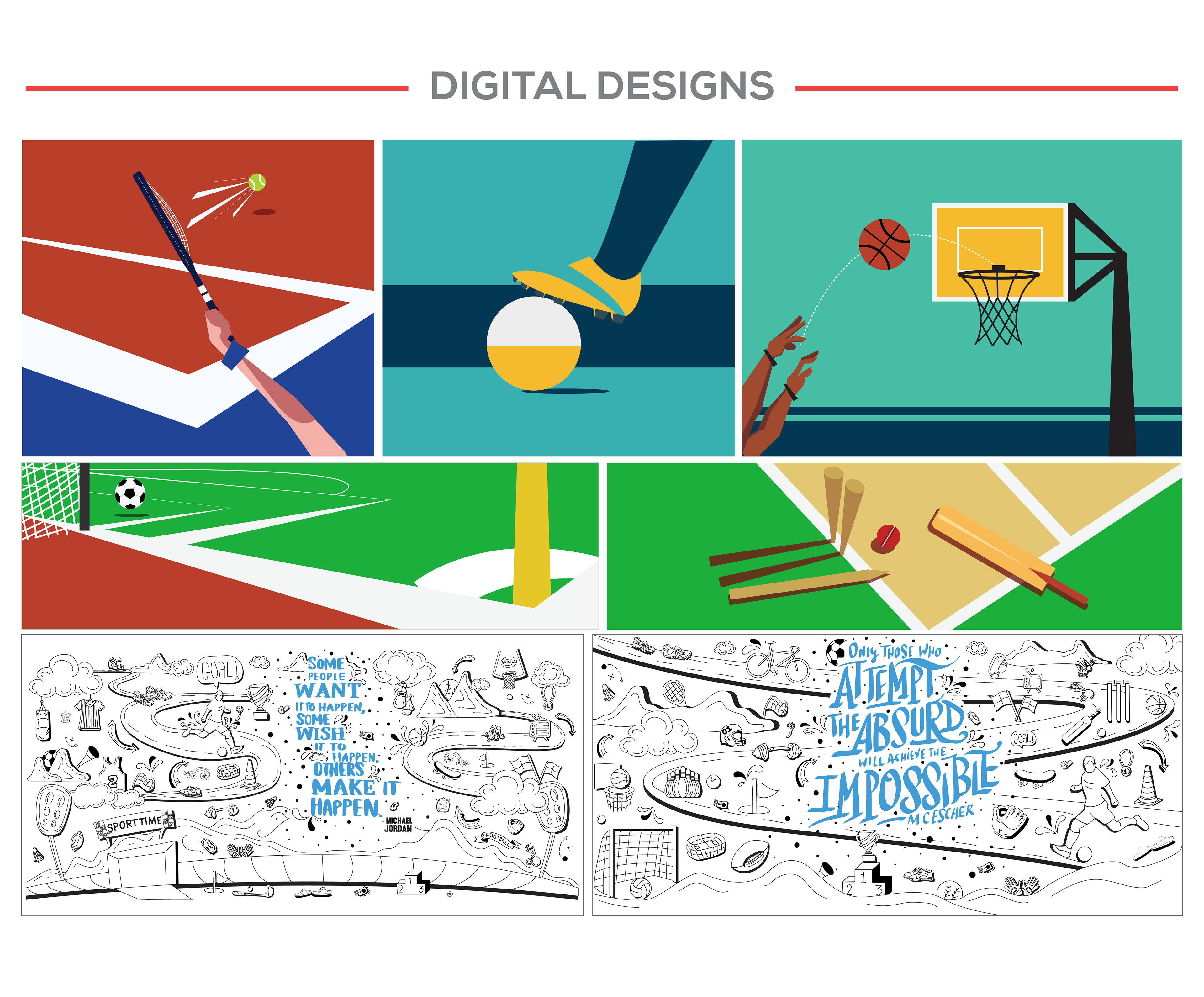 INDIA ON TRACK (IOT) has been setup up to execute the core idea of instilling self-belief and focus among young champions in our country through sports. IOT is known to identify and nurture talent in every corner in India, going through grassroot levels and specialized training programmes. Keeping the core vision and the structure of the company in mind for IOT we came created illustrations which are closely related to the sports offerings along with some motivational quotes to keep the momentum going. We worked around a simple graphic style focusing more on the sporty elements. We played around with themes like Cricket, Football, Basketball, and Tennis. For the motivational walls, we played with a contrast doodle style reflecting sports on the whole. Each wall showcases a sport complimenting the colors of the space and enhancing the look of the overall office/learning institute.