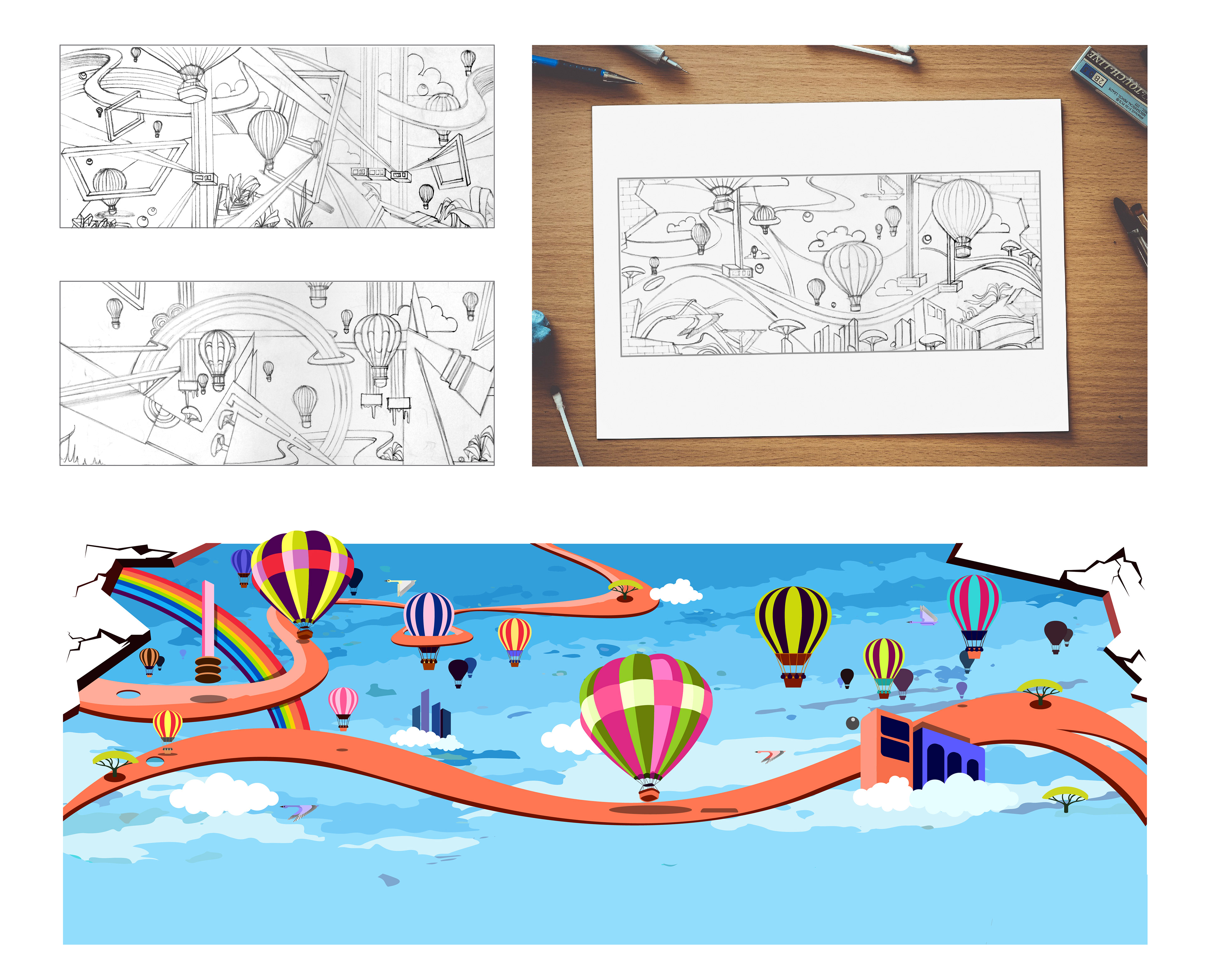 Tittar Lodge Production is an extensive wing of five Verticals, spanning from Travel & Lifestyle to Ad’s, Mobile content, Web Content and Documentaries. With utmost levels of production quality and ethics, we believe in making content that pampers the wanderlust in you – served fresh, on your screen. Keeping their company vision and focus in mind the theme crafted behind the wall murals was to express freedom. Hence the entire play of showing a view of hot air balloons and blue sky which looks like a scene through a broken wall, which seamlessly matches and fits into the space. We have used bright colours and a lot of bright blues to bring in the freshness, and a happy, free vibe to the office space. On the other side we have painted bits of the wall with fun bright geometrical graphic patterns which helps enhance the space and add more vibrancy and colour, being true to the culture of the company and brining in positivity to the office area, conceptualising freedom, expression and vibrancy.